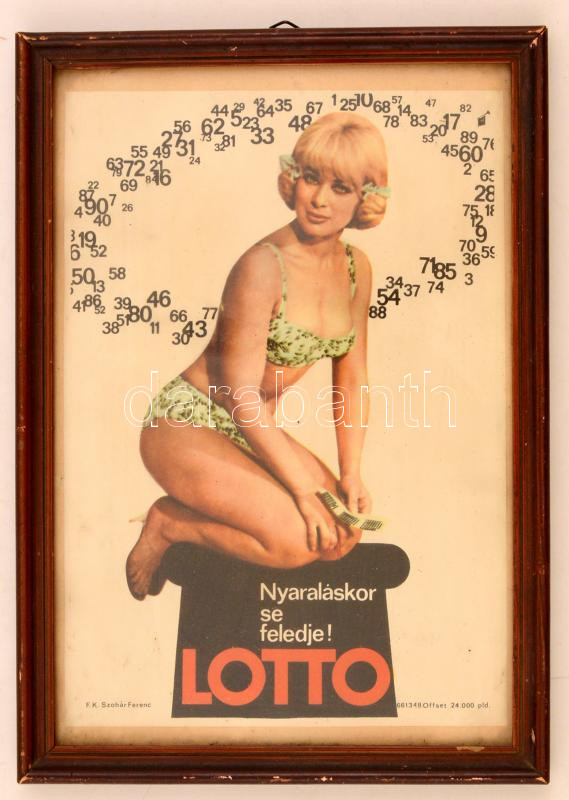 Leírás: cca 1960 "Nyaraláskor se feledje! Lotto" feliratú plakát, üvegezett keretben, 16x24 cm