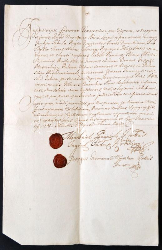 1747 Győr, tanúságlevél özv. Mesterházy Józsefné Sajnovics Anna Mária győri háza ügyében, latin nyelven, Győr vármegye szolgabírójának és esküdtjének gyűrűspecsétjeivel