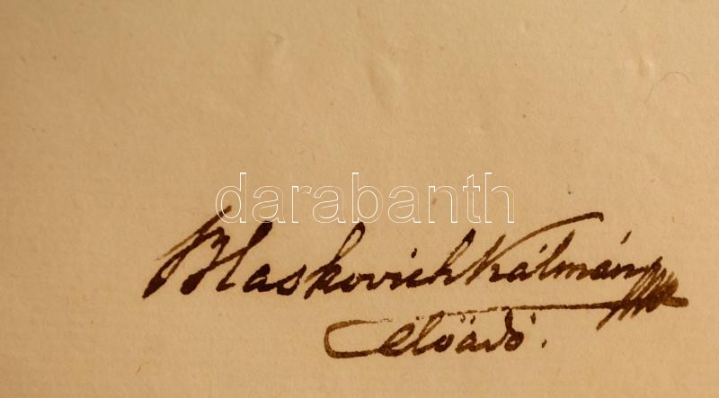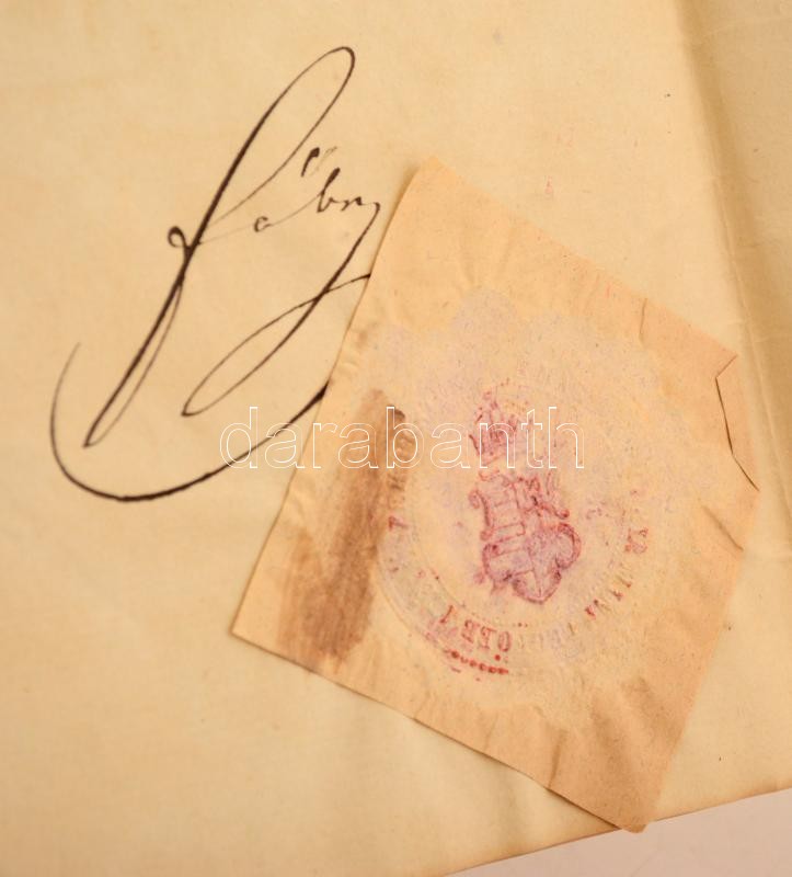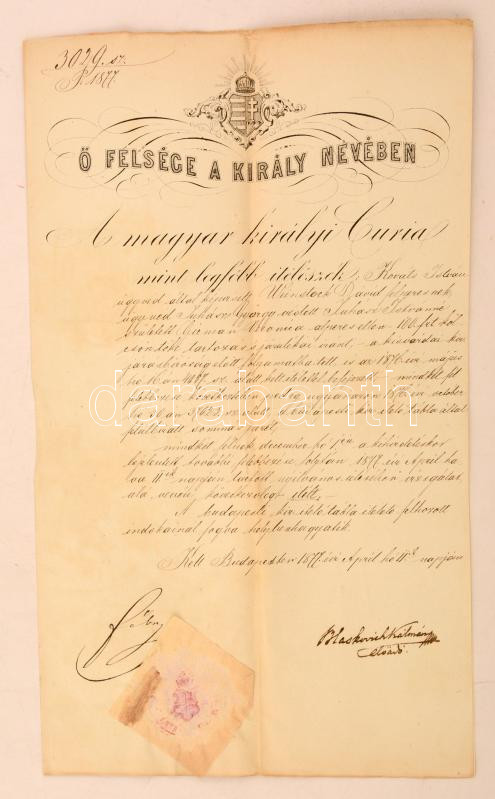 1877 Őfelsége a király nevében a Magyar Királyi Curia, mint legfőbb ítélőszék által hozott ítélet, Weinstock Dávid felperes tartozási ügyében, kisvárdai kir. járásbírósági vonatkozással, szárazpecséttel, Blaskovich Kálmán elnök aláírásával.