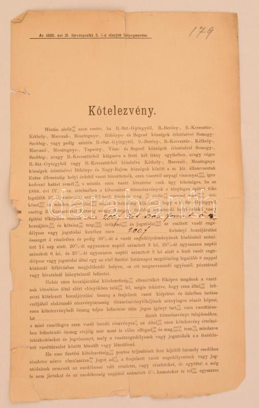Leírás: 1889 A Marcali és környéke vasútvonal építése kapcsán kiállított kötelezvény(200 forint)