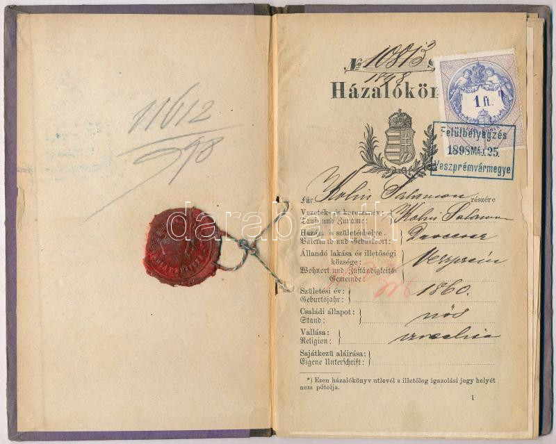 1898 Veszprém vármegye, házalókönyv okmánybélyeggel, a házalást tiltó ... https://www.darabanth.com/hu/276-Gyorsarveres/276.0/Festmeny-mutargy-papirregiseg-egyeb/Okmanyok~200017/1898-Veszprem-varmegye-hazalokonyv-okmanybelyeggel-a-hazalast-tilto-varosok-jegyzekev~II1415377