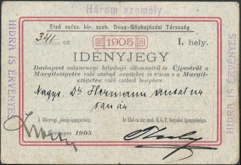 1905 Budapest, a Duna-Gőzhajózási-Társaság helyi idényjegye, hajtva, 8... https://www.darabanth.com/hu/276-Gyorsarveres/276.0/Festmeny-mutargy-papirregiseg-egyeb/Okmanyok~200017/1905-Budapest-a-Duna-Gozhajozasi-Tarsasag-helyi-idenyjegye-hajtva-8C39712-cm~II1415216