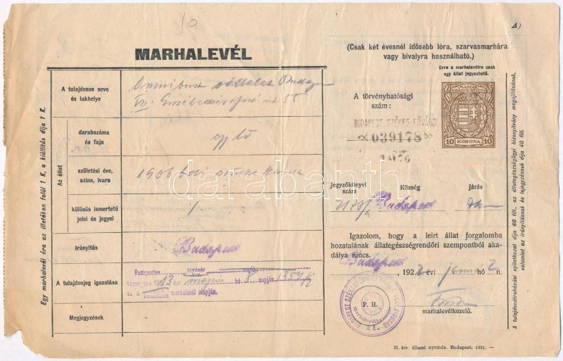1922 Budapest, marhalevél ló számára, sok okmánybélyeggel. Hajtott, sz... https://www.darabanth.com/hu/276-Gyorsarveres/276.0/Festmeny-mutargy-papirregiseg-egyeb/Okmanyok~200017/1922-Budapest-marhalevel-lo-szamara-sok-okmanybelyeggel-Hajtott-szakadt-veterinary-certi~II1415381