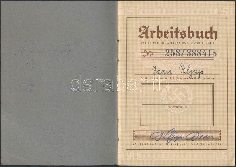 1935 Harmadik birodalmi munkakönyv / Dritte Reich Arbeitsbuch / Third ... https://www.darabanth.com/hu/276-Gyorsarveres/276.0/Festmeny-mutargy-papirregiseg-egyeb/Okmanyok~200017/1935-Harmadik-birodalmi-munkakonyv-Dritte-Reich-Arbeitsbuch-Third-Reich-labour-book-15C39711-cm~II1413004