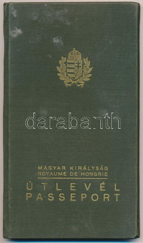 1938 Keményfedeles magyar útlevél / Hungarian passport https://www.darabanth.com/hu/276-Gyorsarveres/276.0/Festmeny-mutargy-papirregiseg-egyeb/Okmanyok~200017/1938-Kemenyfedeles-magyar-utlevel-Hungarian-passport~II1410116