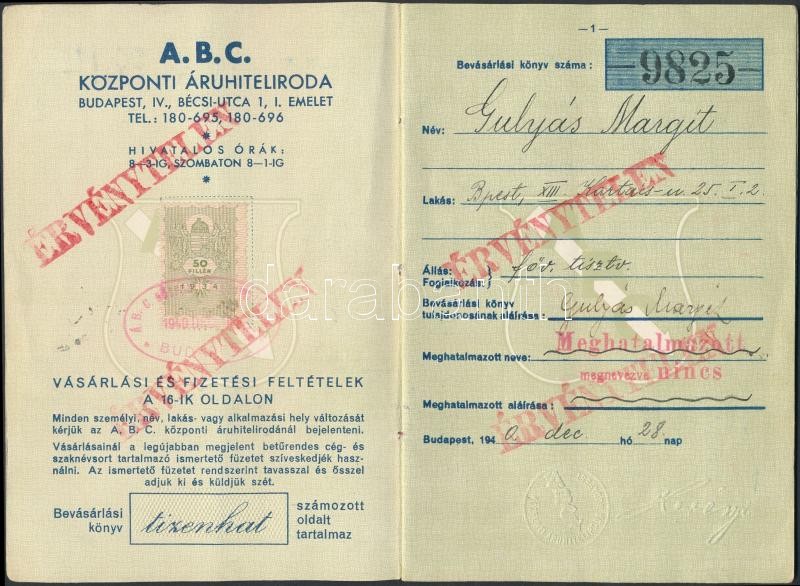 Leírás: 1940 Bp., ABC Központi Áruhiteliroda bevásárlási könyv érvénytelenítve