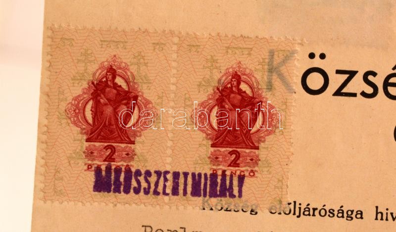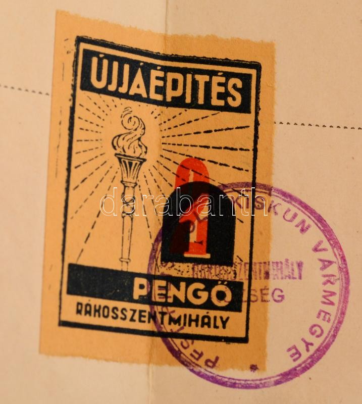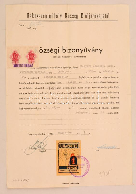 Leírás: 1940 Budapest, Rákosszentmihály. Községi bizonyítvány politikai magatartás igazolására. Okmány- és újjáépítési bélyegekkel, hajtva