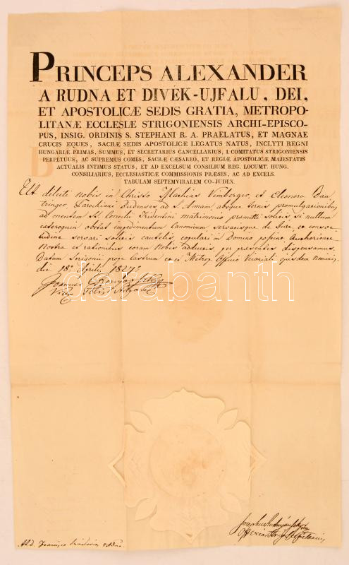 Leírás: 1827 Benyovszky János(1756-1827) püspök és Rudnyánszky József (1788-1859) püspök aláírása szárazpecsétes hivatalos okmányon