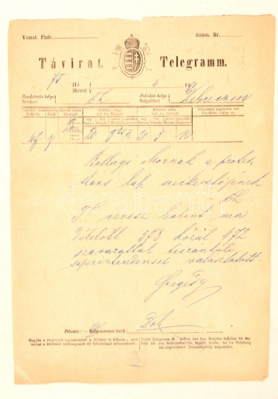 1871 Távirat Ballagi Mór (1815-1891) teológus, nyelvész, szerkesztőnek (Protestáns Egyházi és Iskolai Lap) a tiszántúli a szuperintendensi választásáról, Szegedy aláírással, Ballagi Aladár gyűjteményi bélyegzőjével.
