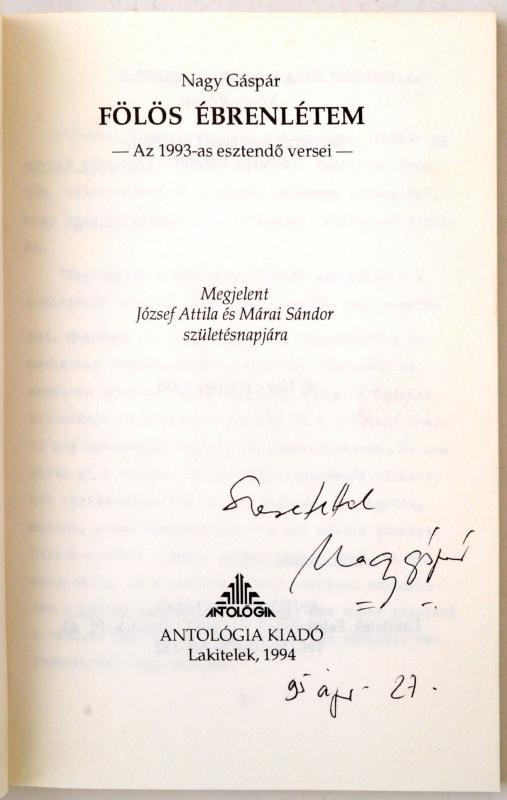 Leírás: Nagy Gáspár: Fölös ébrenlétem. Lakitelek, 1994, Antológia Kiadó. Kiadói papírkötés. A szerző által aláírt.
