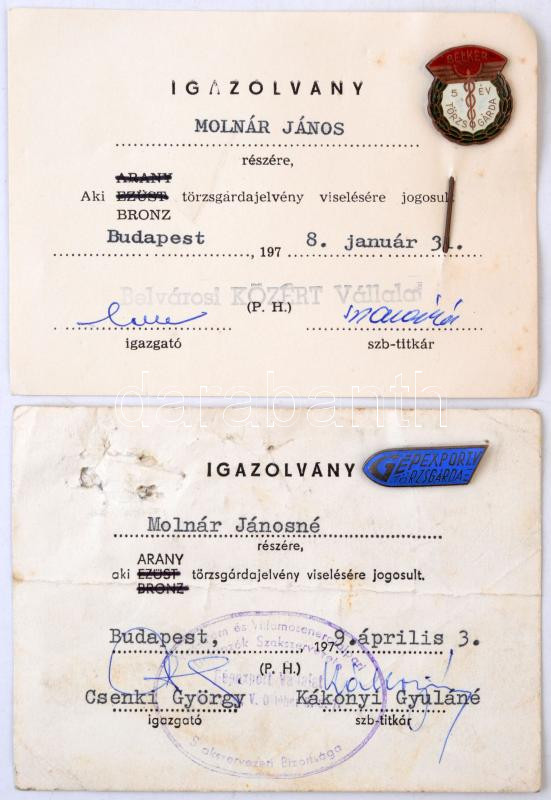 Leírás: 1978. "Belker - 5 év törzsgárda" bronz fokozata, zománcozott jelvény, viselői igazolvánnyal + 1979. "Gépexport Törzsgárda" arany fokozata, zománcozott jelvény, viselői igazolvánnyal T:2