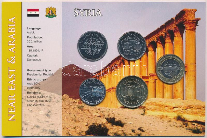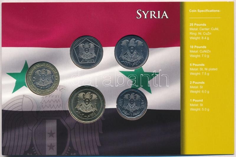 Syria 1997-2003... https://www.darabanth.com/hu/276-Gyorsarveres/276.0/Numizmatika/Kulfoldi-fem-es-ezustpenzek~300015/Sziria-1997-2003-1C581-25C581-5xklf-fempenz-szettben-T1--Syria-1997-2003-1-Pound--25-Pounds-5x~II1410133