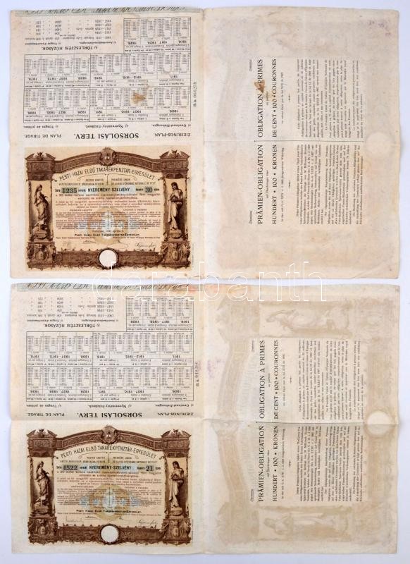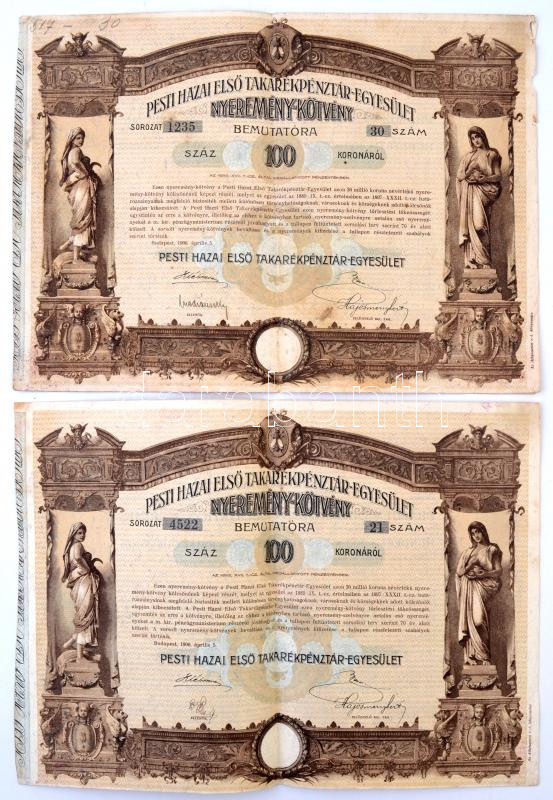 Leírás: Budapest 1906. "Pesti Hazai Első Takarékpénztár-Egyesület" nyeremény-kötvénye 100K-ról (2x), szárazpecséttel, nyereményszelvénnyel T:II-,III fo.