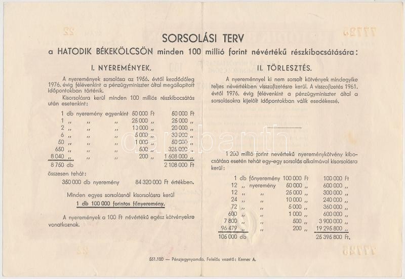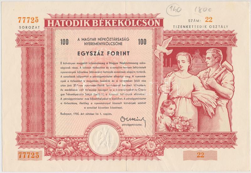 Leírás: Budapest 1955. "Hatodik Békekölcsön" nyereménykölcsön 100Ft-ról, szárazpecséttel T:II-