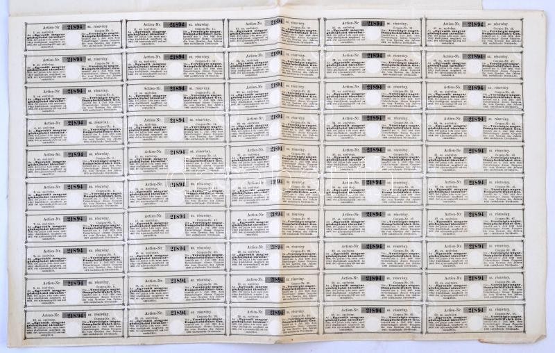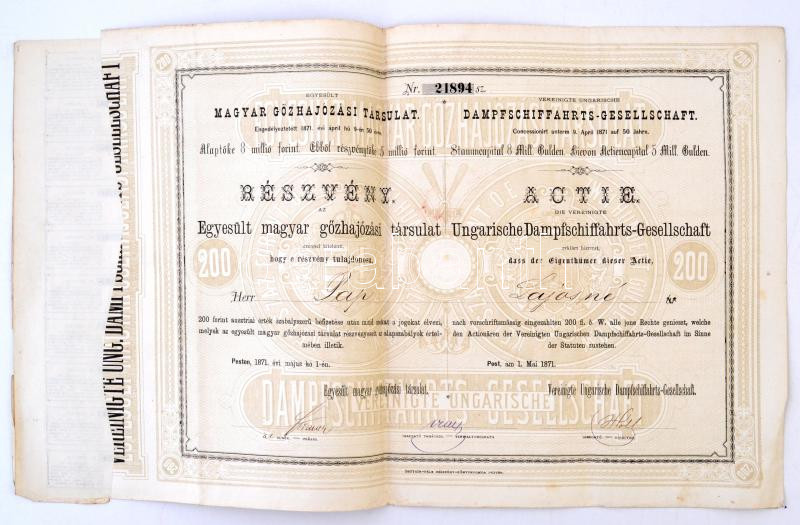 Budapest / Pest 1871. "Egyesült magyar gőzhajózási társulat - DDSG" részvénye 200Ft-ról, magyar és német nyelven, szárazpecséttel, szelvényekkel, sorszámkövető a 30045-ös számú tétellel T:III kis szakadás