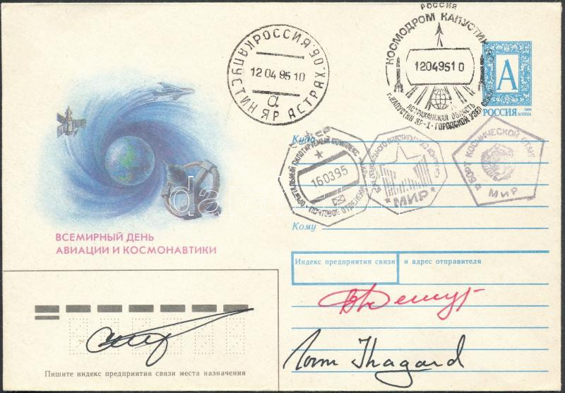 Vlagyimir Gyezsurov (1962- ), Gennagyij Sztrekalov (1940-2004) szovjet és Norman Thagard (1943- ) amerikai űrhajósok aláírásai emlékborítékon, MIR alkalmi bélyegzéssel /