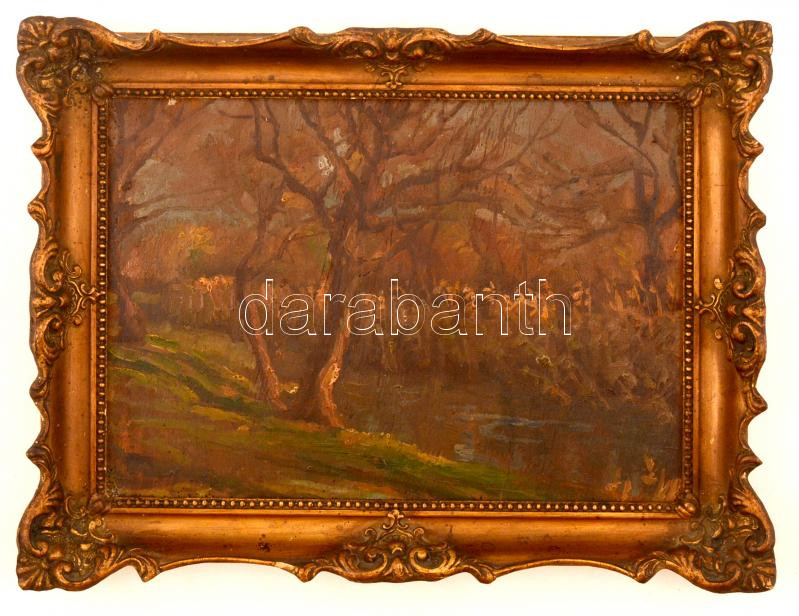 Leírás: Jelzés nélkül: Fák a patakparton. Olaj, falemez, 24×34 cm
