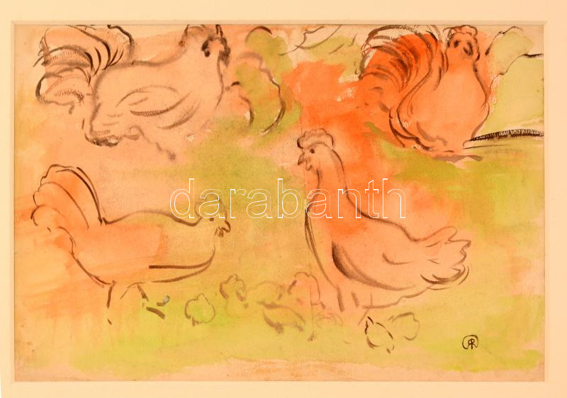 RR jelzéssel: Kakasok, tyúkok. Akvarell-tus, papír, 28×41 cm https://www.darabanth.com/hu/277-Gyorsarveres/277.0/Festmeny-mutargy-papirregiseg-egyeb/Festmenyek-es-grafikak~1/RR-jelzessel-Kakasok-tyukok-Akvarell-tus-papir-28C39741-cm~II1415844