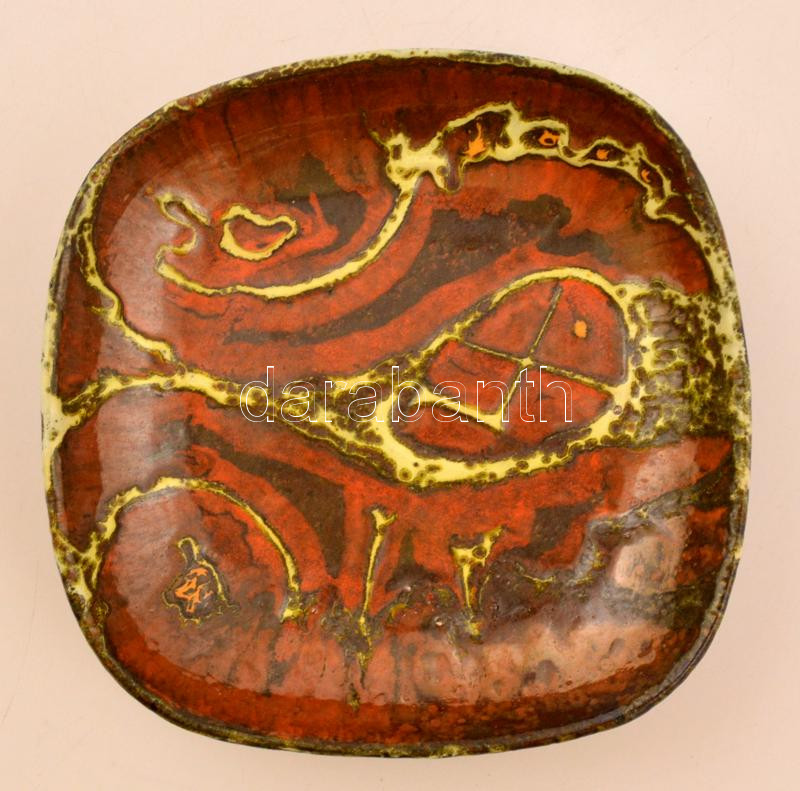 Leírás: Pál Ferenc(1914-2008) kerámia fali tál, kézzel festett, jelzett, hátoldalon apró lepattanással, 22x22 cm