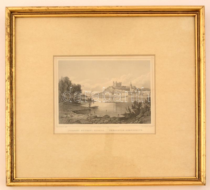 Leírás: cca 1860 Ludwig Rohbock (1820-1883):Pozsony nyugati oldala / Pressburg Abendseite, acélmetszet, papír, paszpartuban, üvegezett fa keretben, 14×17,5 cm
