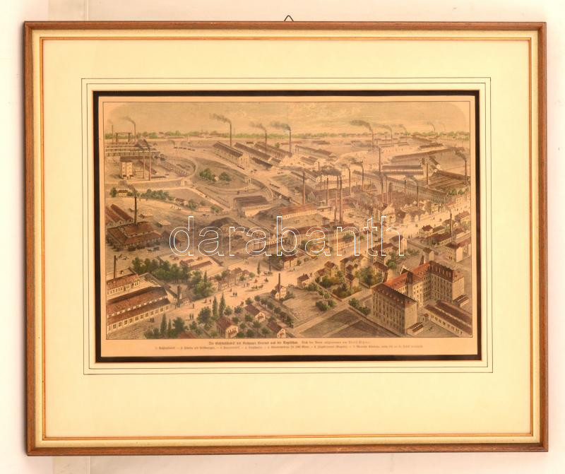 cca 1870 Bochum, acélgyár nagyméretű., színezett fametszet, igényes üvegezett keretben / cca 1870 Bochum steel factory large wood engraving in quality glazed frame 58x46 cm