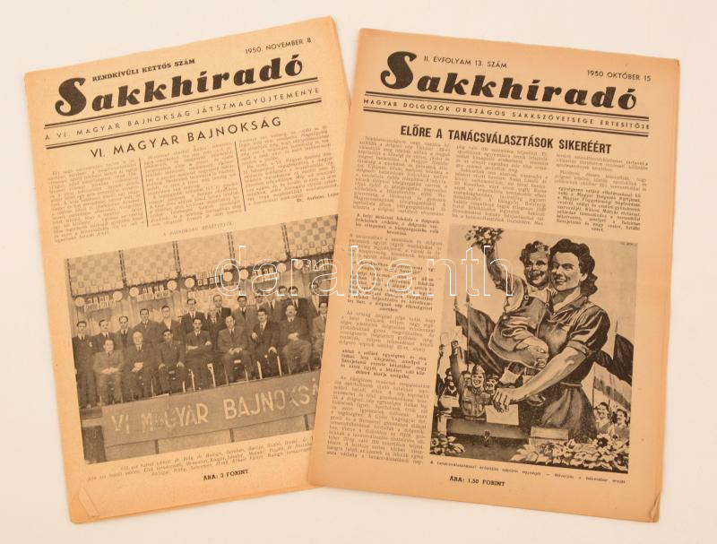 1950 Sakkhíradó folyóirat, két szám (1950. október 15., 1950. november... https://www.darabanth.com/hu/277-Gyorsarveres/277.0/Festmeny-mutargy-papirregiseg-egyeb/Sakk~29/1950-Sakkhirado-folyoirat-ket-szam-1950-oktober-15-1950-november-8-Szerkesztette-Szab~II1417527