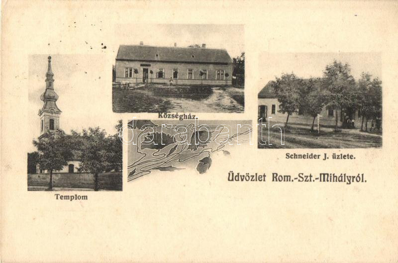 Leírás: Bégaszentmihály, Románszentmihály; Templom, Községháza, Schneider J. üzlete / church, town hall, shop, Art Nouveau
