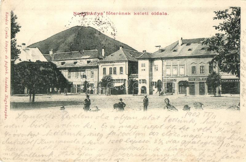 Leírás: Nagybánya, Baia Mare; Fő tér keleti oldala, Kindris, Herskovits J. és T., Rosenfeld és Platthy Dezső üzlete / main square, shops (Rb)
