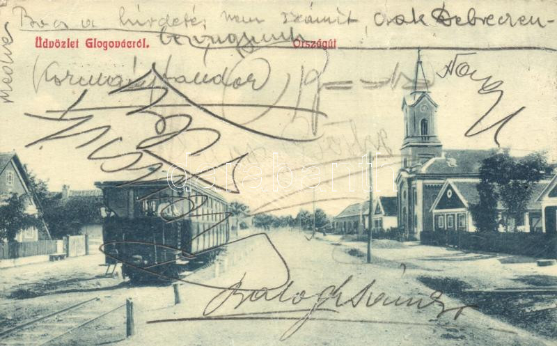 Öthalom, Glogovác, Vladimirescu; Országút, helyiérdekű vasút, vonat, templom, hátoldalon Wágner hangszer király reklám, W. L. 2999. / street, railway, train, church, advertisement on backside (fa)