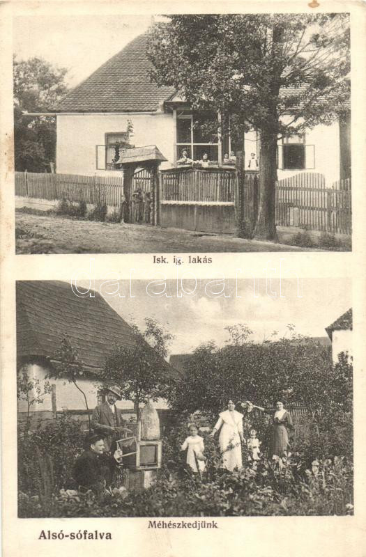 Leírás: Sófalva, Alsó-Sófalva, Sarata; Iskola igazgató lakása, méhészek, Ruczeszdorfer felvétele / principal's house, beekeepers (Rb)