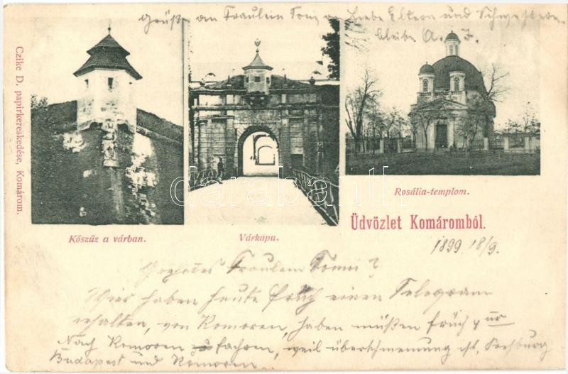 Leírás: 1899 Komárom, Komárno; Kőszűz a várban, Rosália templom, Várkapu, kiadja Czike D. / castle, gate, church