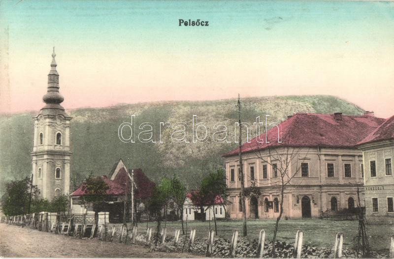 Leírás: Pelsőc, Plesivec; Piac tér, templom / market place, church (b)