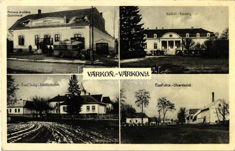 Leírás: Várkony, Varkon, Vrakún; Fogyasztási szövetkezet, Pfeiffer-kastély, iskola, utca, autóbusz, foto Otto Brunner / shop, castle, school, street, autobus