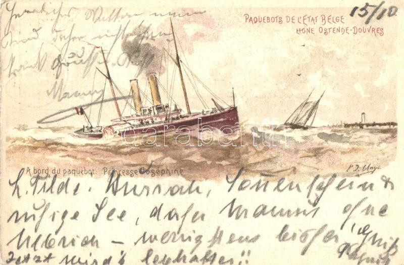 Leírás: Paquebots de l'Etat Belge, Ligne Ostene-Douvres / Belgian ship, SS Princess Josephine with shipping stamps on the backside, litho, Ga. (EK)