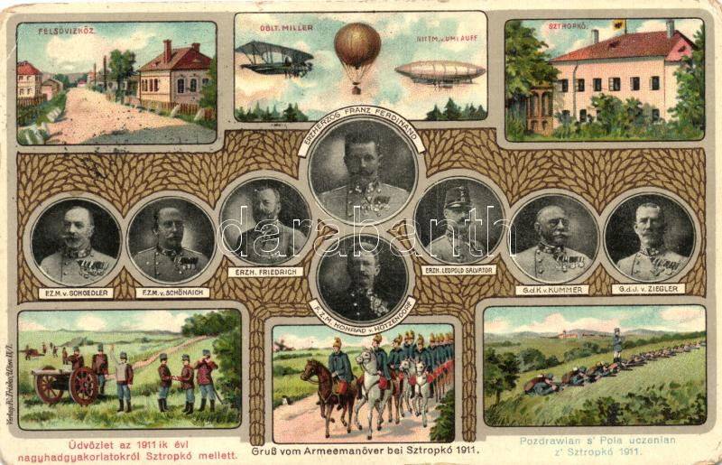 Sztropkó és Felsővízköz, Stropkov, Svidník; 1911. évi hadgyakorlatok, katonai repülő, hőlégballon, léghajó, Franz Ferdinand és katonatisztek / military maneuvers, aircraft, airship, balloon, military officers, Art Nouveau litho (EK)