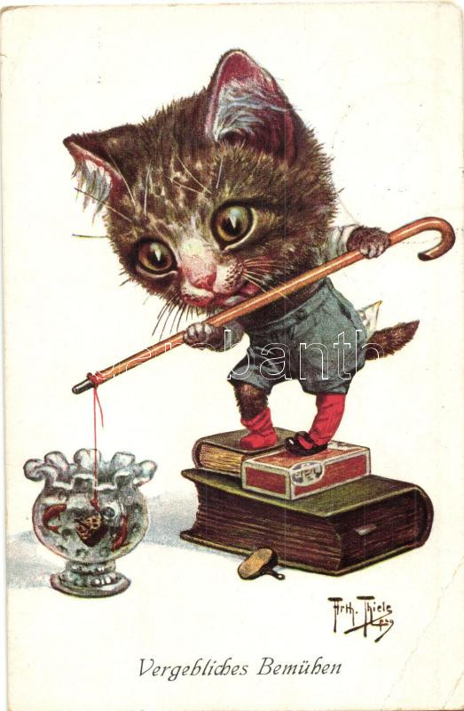 Leírás: Vergebliches Bemühen / cat, T.S.N. Serie 1964. s: Arthur Thiele (EB)