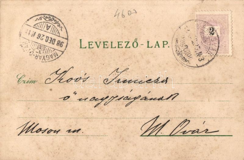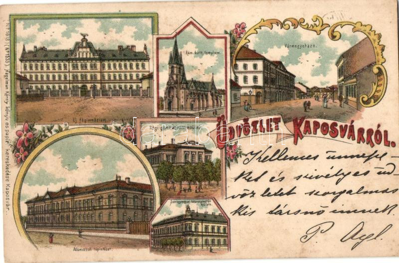 1898 Kaposvár, Vármegyeháza, takarékpénztár, régi gimnázium, új főgimnázium, államvasúti tápintézet, római katolikus templom, kiadja Hagelman Károly, floral Art Nouveau litho