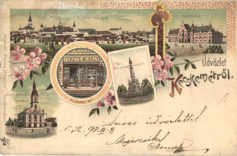 1898 Kecskemét, Fekete Mihály könyvkereskedése, saját kiadása; floral ... https://www.darabanth.com/hu/277-Gyorsarveres/277.0/Kepeslapok/Magyarorszag~300009/1898-Kecskemet-Fekete-Mihaly-konyvkereskedese-sajat-kiadasa-floral-litho-b~II1417992
