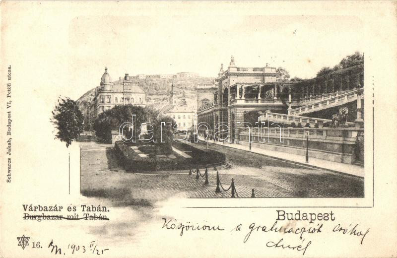 Budapest I. Várbazár és Tabán, kiadja Schwarcz Jakab https://www.darabanth.com/hu/277-Gyorsarveres/277.0/Kepeslapok/Magyarorszag~300009/Budapest-I-Varbazar-es-Taban-kiadja-Schwarcz-Jakab~II1419017