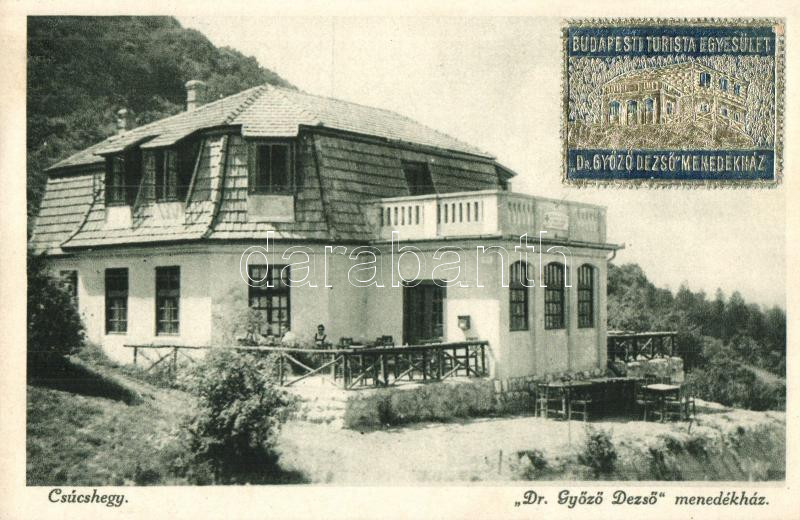 Leírás: Budapest III. Csúcshegy Dr. Győző Dezső menedékház, Vajda József felvétele; a Budapesti Turista Egyesület matricájával