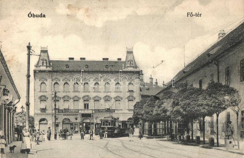 Leírás: Budapest III. Óbuda, Fő tér, villamos, Takarékpénztár, Réb Károly üzlete (EK)