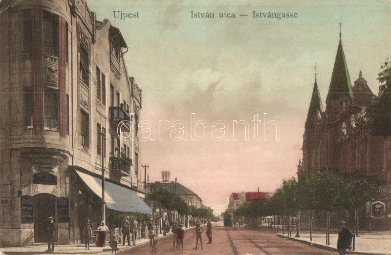 Budapest IV. Újpest, István utca, Otthon Nagy kávéház, villamos (EK) https://www.darabanth.com/hu/277-Gyorsarveres/277.0/Kepeslapok/Magyarorszag~300009/Budapest-IV-Ujpest-Istvan-utca-Otthon-Nagy-kavehaz-villamos-EK~II1419051