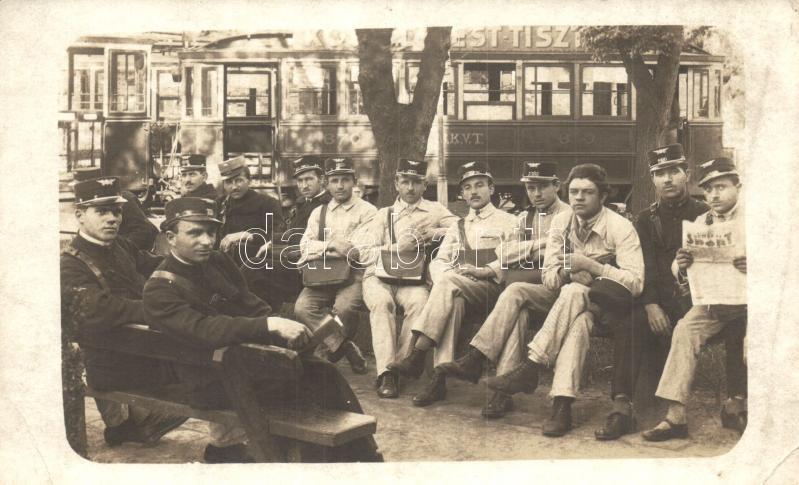 Leírás: Budapest, Villamos vezetők és ellenőrök csoportképe a Budai Közúti Vaspálya Társaság villamosa előtt, Nemzeti Sport újságot olvasó munkás, photo (EK)