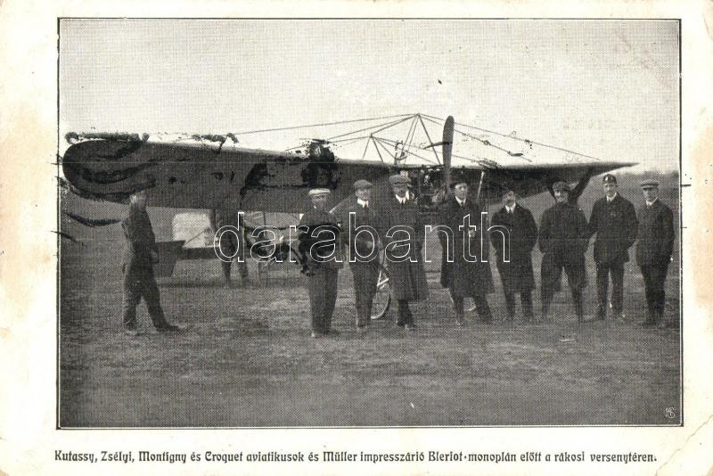 Budapest XV. Rákosmező; Kutassy, Zsélyi, Montigny és Croquet aviatikusok és Müller impresszárió Bleriot monoplán előtt a rákosi versenytéren, Wágner hangszerkirály reklám a hátoldalon (EB)