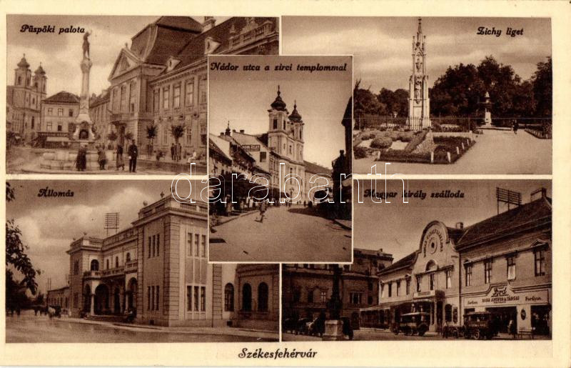 Székesfehérvár, Vasútállomás, püspöki palota, Magyar király szálloda, ... https://www.darabanth.com/hu/277-Gyorsarveres/277.0/Kepeslapok/Magyarorszag~300009/Szekesfehervar-Vasutallomas-puspoki-palota-Magyar-kiraly-szalloda-Nador-utca-Zichy-l~II1416016