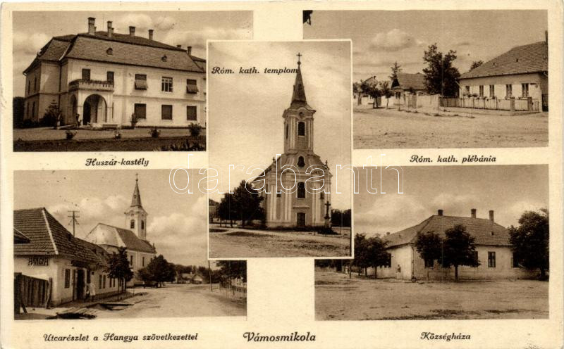 Leírás: Vámosmikola, Huszár kastély, Hangya szövetkezet, Községháza, Római katolikus templom és plébánia