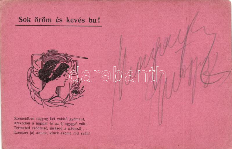 Sok öröm és kevés bú!; Szász Gerő költeménye Art Nouveau művészlap, Kö... https://www.darabanth.com/hu/277-Gyorsarveres/277.0/Kepeslapok/Muveszlapok~300072/Sok-orom-es-keves-bu-Szasz-Gero-koltemenye-Art-Nouveau-muveszlap-Korjegyzoi-Nyomda-~II1424635