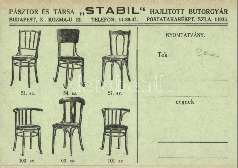 Budapest X. Kozma u. 13. Pásztor és Társa 'Stabil' hajlított bútorgyár... https://www.darabanth.com/hu/277-Gyorsarveres/277.0/Kepeslapok/Reklam~300092/Budapest-X-Kozma-u-13-Pasztor-es-Tarsa-Stabil-hajlitott-butorgyar-kihajthato-reklamlap~II1419589