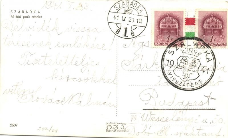 1941 Szabadka, Subotica; Főtér, park / main square, park, 'Szabadka vi... https://www.darabanth.com/hu/277-Gyorsarveres/277.0/Kepeslapok/Vajdasag~300014/1941-Szabadka-Subotica-Foter-park-main-square-park-Szabadka-visszatert-So-Stpl~II1424113