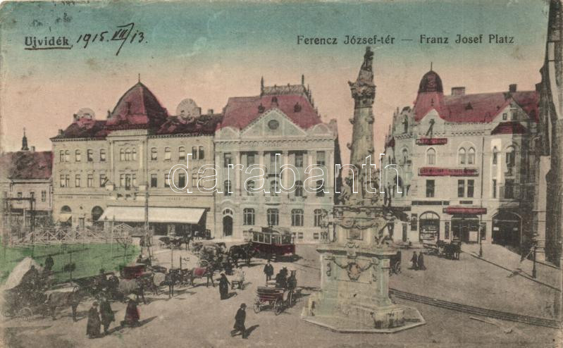 Újvidék, Novi Sad; Ferenc József tér, villamos, Első Magyar Biztosító Társaság, Dornstadter Jakab, Kovács József üzletei, sörcsarnok, kiadja Klein Mariska / square, tram, insurance company, shops, beer house (EK)
